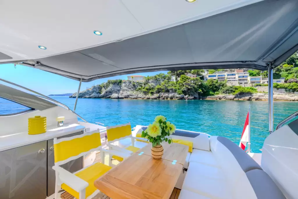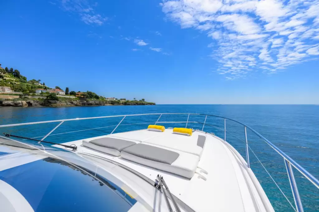 Guests praise the modern comfort, stability at sea, and elegant layout of the Princess V40 “Katsu.” It’s perfect for smooth cruising and luxurious socializing. Whether enjoying lunch at anchor or sunbathing in style, it’s a top choice for intimate group charters from Monaco.